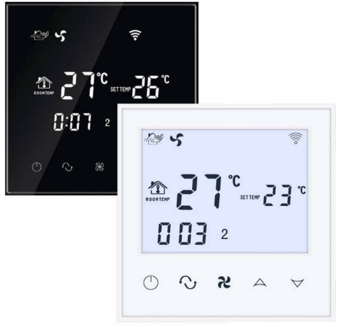 - Стеклянная сенсорная панель черного цвета Управление вентилятором 0-10 постоянного тока 7 дней, будний / выходной, круглосуточный график - Четыре или шесть настроек вдень